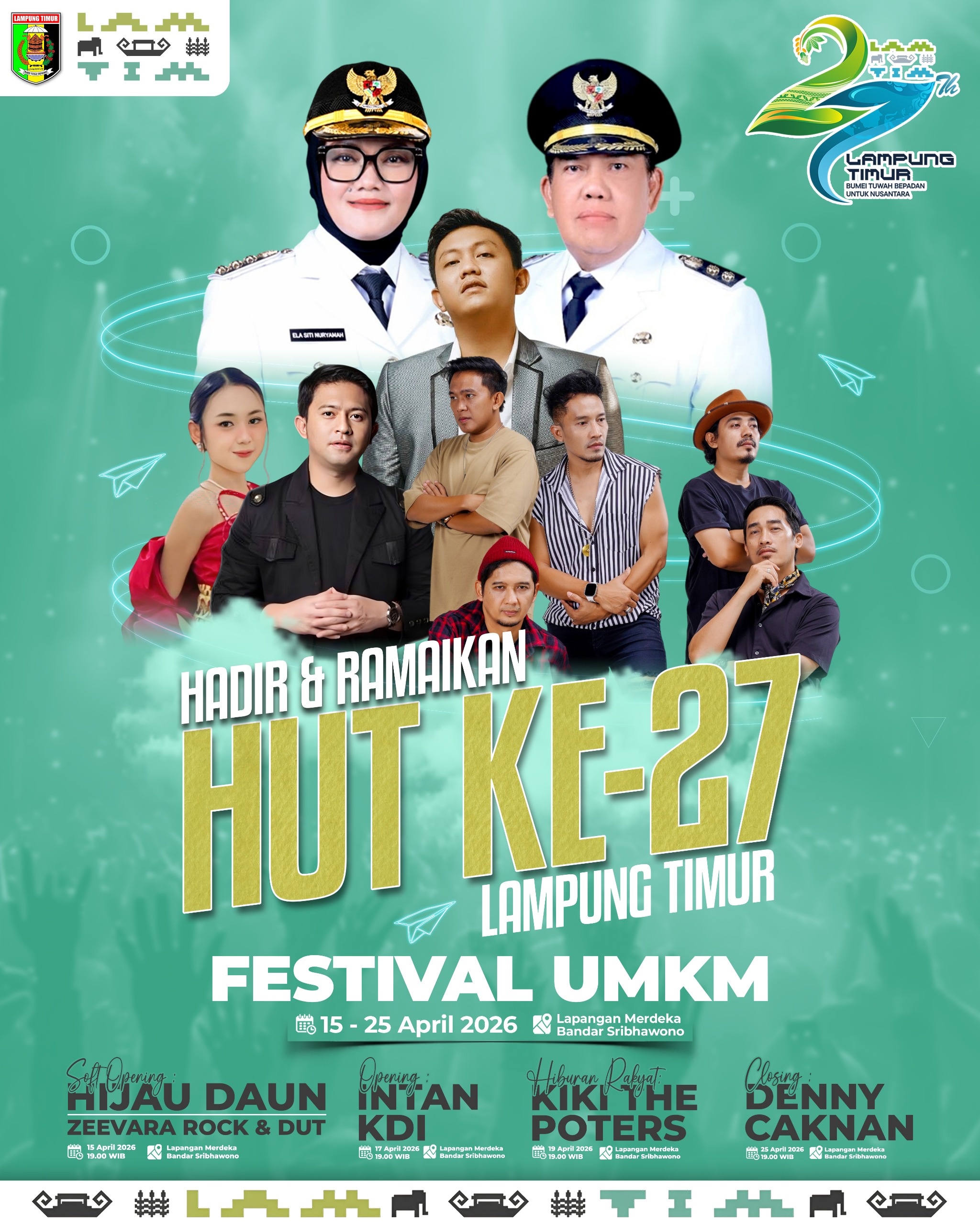 Puncak perayaan Hari Ulang Tahun (HUT) ke-27 Kabupaten Lampung Timur dipastikan berlangsung meriah. Penampilan spesial dari penyanyi populer Denny Caknan pada malam penutupan diprediksi akan menyedot perhatian ribuan masyarakat dan diperkirakan dipadati penonton dari berbagai daerah, Sabtu (25/04/2026).